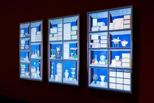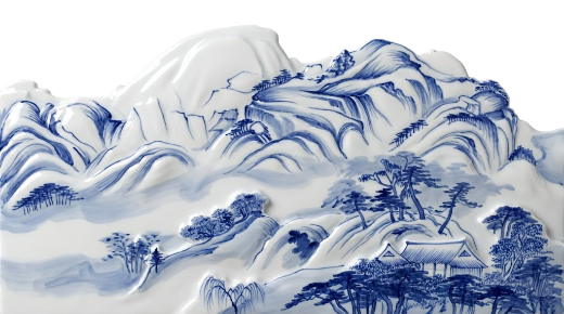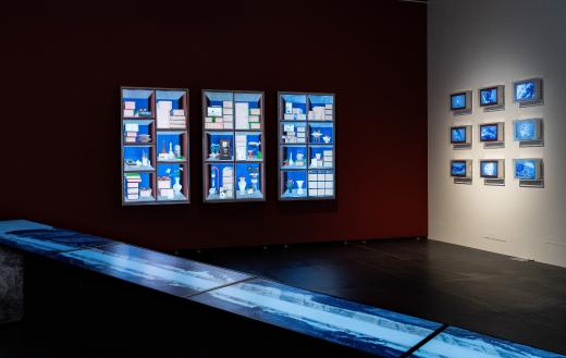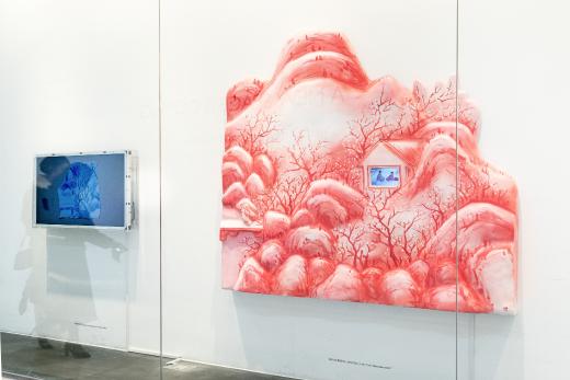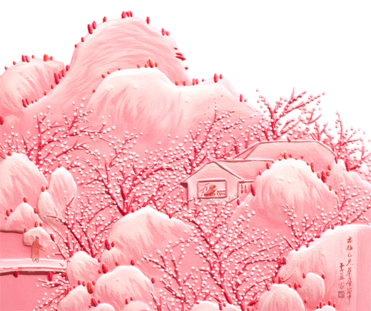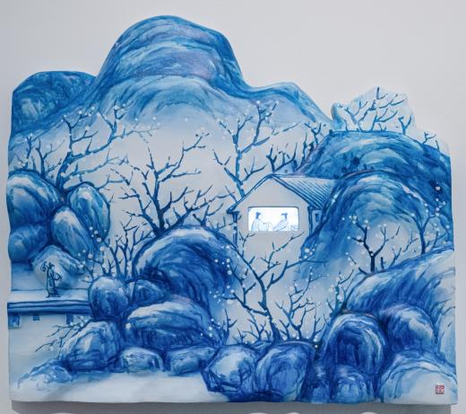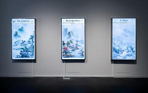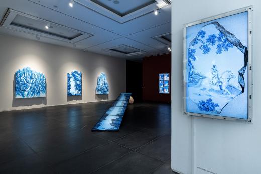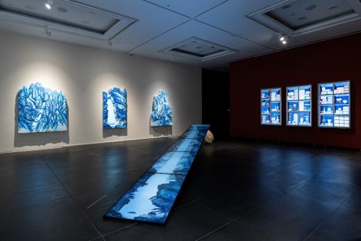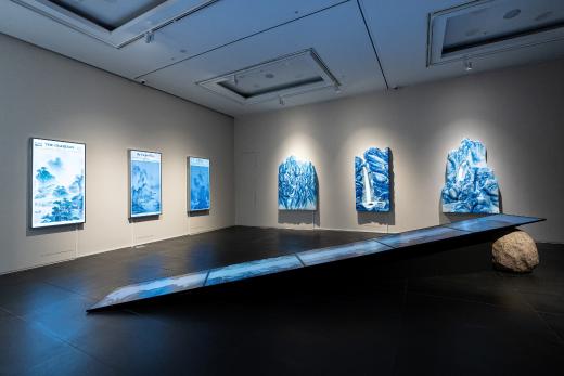 전시장을 들어서면 가장 먼저 마주하게 되는 〈박연폭포〉는 원화의 크기를 확대하고 설치 위치를 변화시킴으로써, ‘새롭게 바라보는’ 감각을 자연스럽게 전달합니다. 이번 전시에서 처음 선보이는 청화백자 스타일의 부조 연작은 〈인왕제색도〉와 〈매화초옥도〉 등 명화를 입체 공간 안에 자리하게 함으로써, 감상자의 위치에 따라 다른 인상을 만들어냅니다. 회화의 요소를 3D 영상으로 구현한 작품들은 새로운 기술을 도입하여 이미지를 재구성한 가장 직관적인 예입니다. 햇살이 일렁이는 전시장 안쪽으로 들어서면 다른 시기와 지역, 문화권에서 제작된 강희안의 〈고사관수도〉와 클로드 모네의 〈해돋이〉가 빛을 매개로 함께 제시됩니다. 감상자는 갤러리 바닥에 투사된 노을빛 속에서 어느새 풍경의 일부가 됩니다. 마지막으로 마주하는 윤두서의 〈자화상〉에 부착된 거울은 관객의 모습을 비추며, ‘지금 이 자리’의 시선을 호출하고 전시의 방점을 찍습니다.