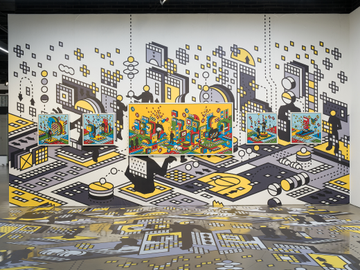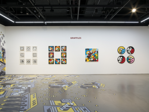 그라플렉스는 디지털 환경의 최소 단위인 '픽셀(Pixel)'과 게임 속 논리가 현실의 캔버스와 만났을 때 발생하는 시각적 변주를 탐구합니다. 모니터 안에서만 존재하던 이 기하학적 형태들은 작가만의 볼드(bold)한 라인을 입고 현실의 공간으로 튀어나옵니다. 거대한 '게임 스테이지’로 변모한 전시장은 작고 견고한 사각형인 픽셀로 해체되고 다시 조립됩니다. 8비트 게임 속의 단순한 풍경이 회화적 질서로 치환되는 과정은, 우리가 익숙하게 여겼던 물리적 세계를 전혀 다른 차원의 시점으로 바라보게 합니다.